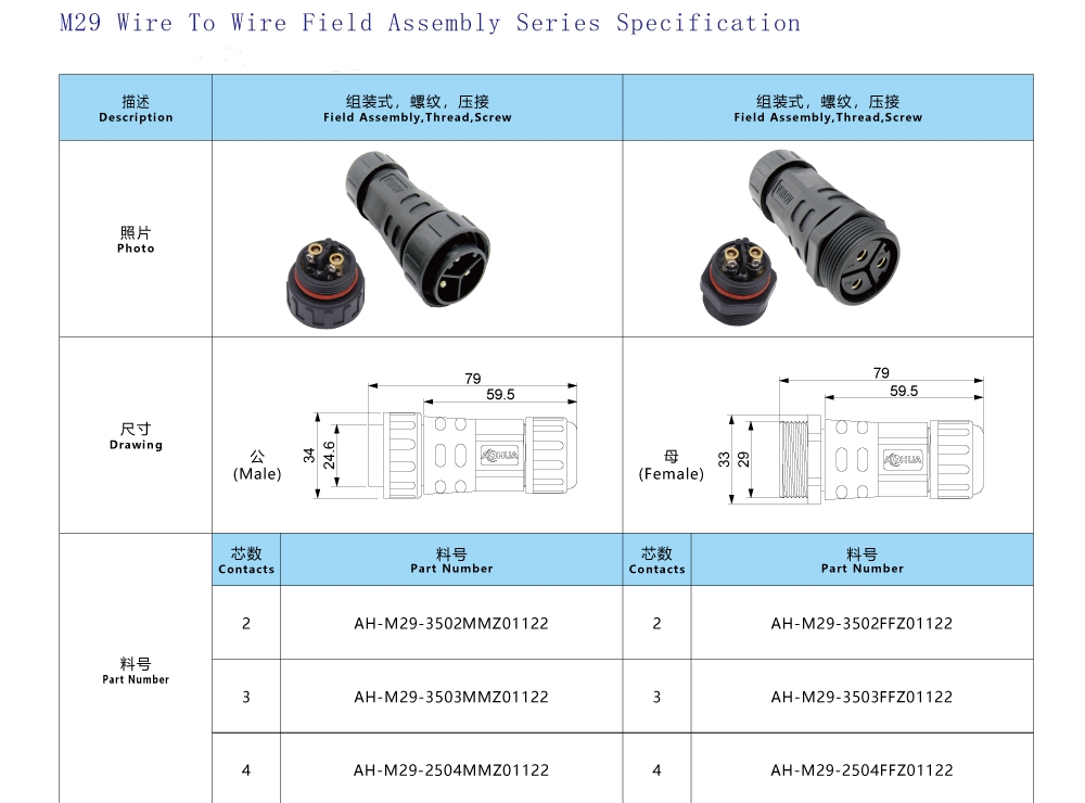 /Ahua Manufacturer IP67/IP68 M29 4 Pin Electric Male Female Cable Waterproof Connectors