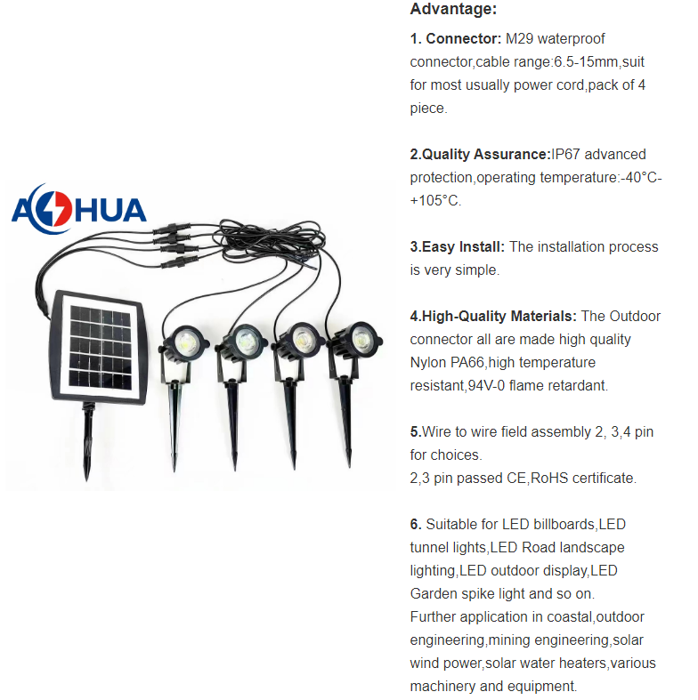 connectors are suitable for quick connection of garden and outdoor displays,floor heating,beacons,cruise ships,LED billboards,LED tunnel lights,LED street lights,external wiring,ect.