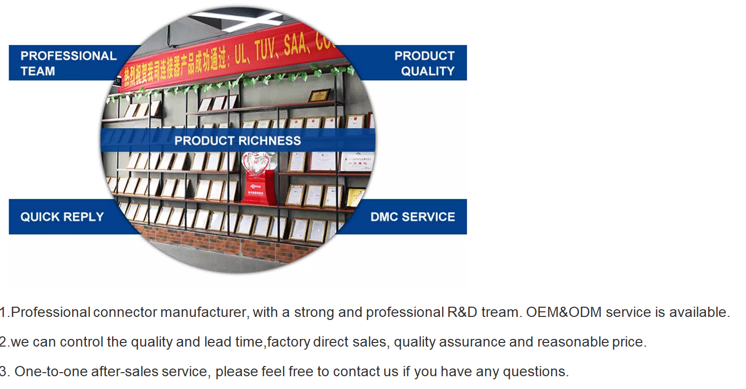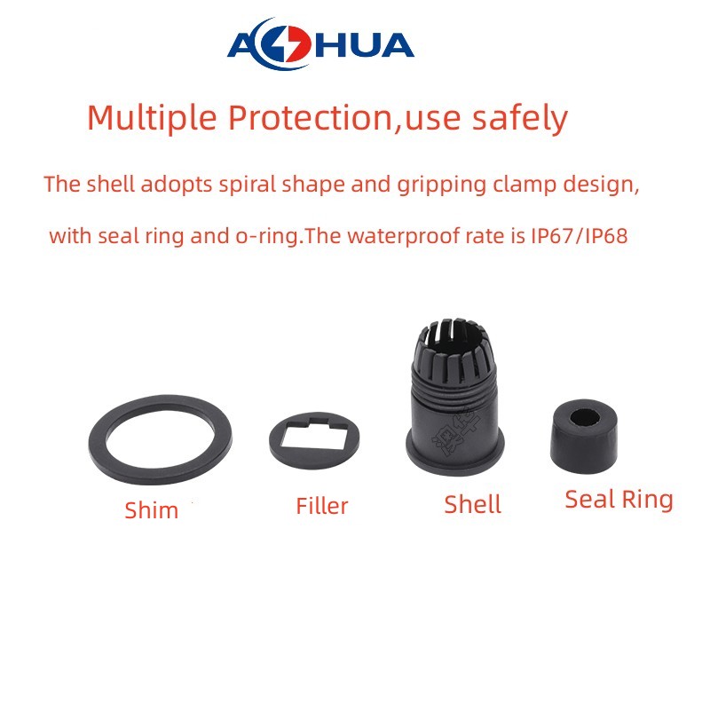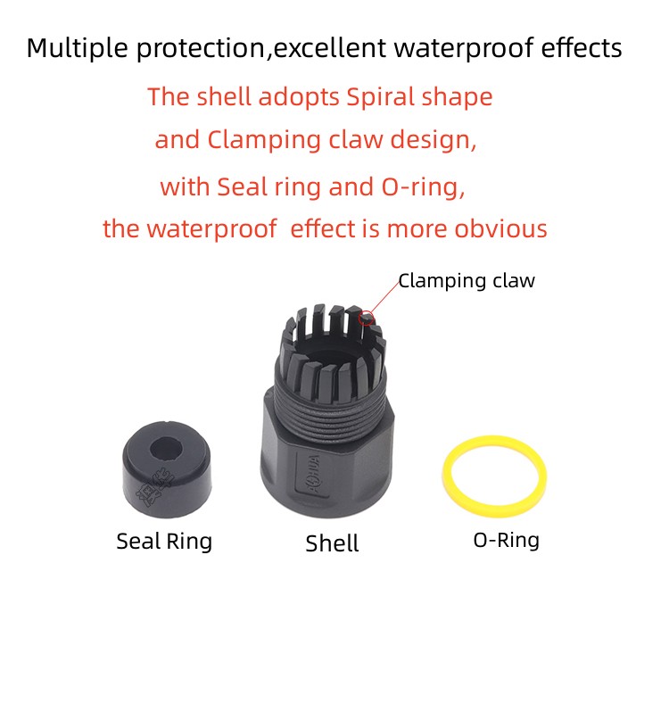 4.Shell adopts Classy Nylon,with strong temperature resistance, corrosion resistance,pressure resistance,94V0 flame retardant,Non-toxic, environmental protection.Clamping hand and sealing rubber ring design,with the tightening head,easy to install,clamping the waterproof and sealing performance.Contact material is Brass to ensure the connector can be used longer,economic and durable.