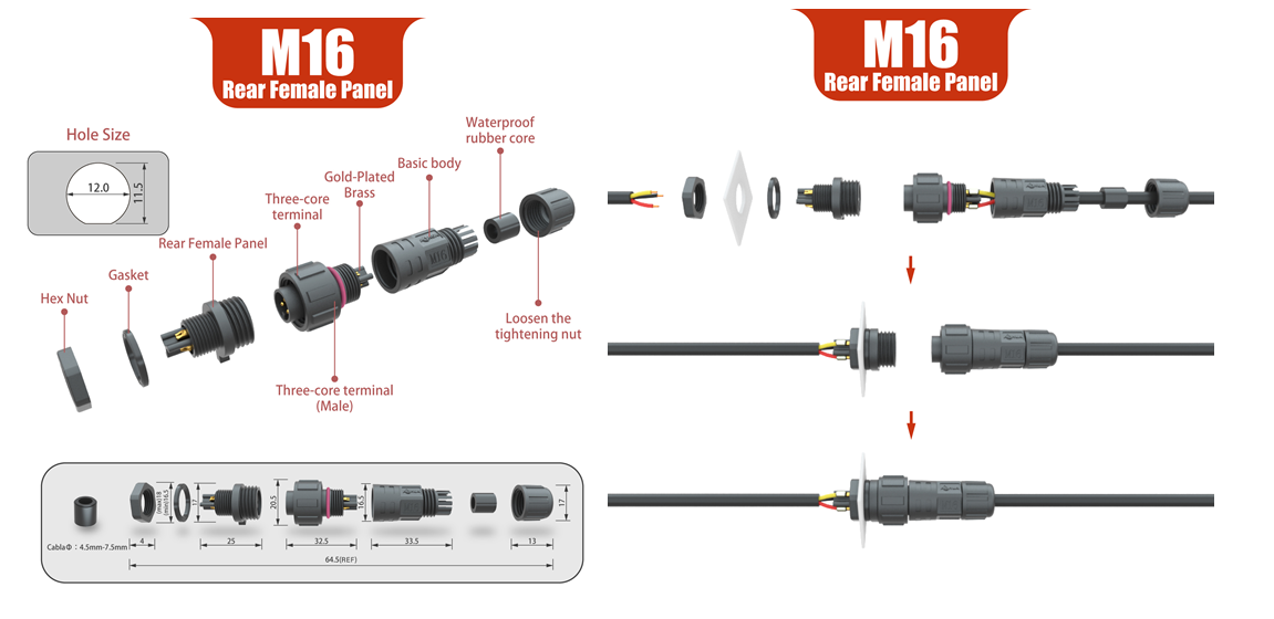 In conclusion, the IP67 M16 3-Pin Female rear panel mount socket is an excellent choice for control box applications. Its advantages, including the use of high-quality flame-resistant nylon PA66 material, self-manufactured gold-plated brass pins, and multiple pin configuration options, make it a reliable and versatile connector. With its certifications and adherence to international standards, this connector guarantees high performance, safety, and environmental compliance in control box applications.