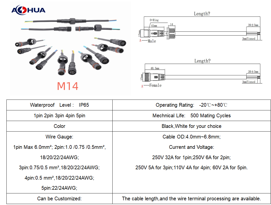 The M14 Pre-Wire Male Female Waterproof Cable Connector features an IP65 waterproof rating, making it suitable for use in both indoor and outdoor settings.