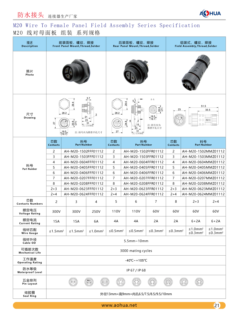 Aohua UL Wire to Female Front panel Mount Assembly Circular Plastic Plug M12 M16 M20 Waterproof Connector IP67 for LED Display