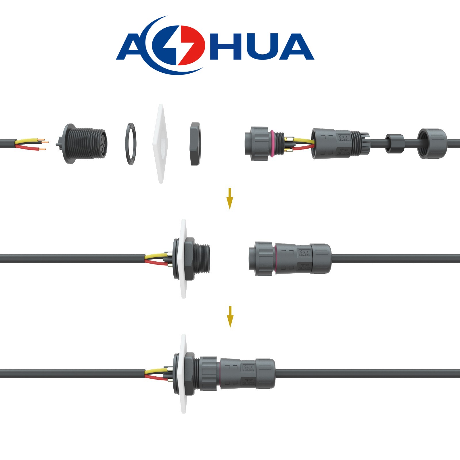 Assembly waterproof plug is suitable for indoor/outdoor,such as outdoor led lighting,LED panel screens, outdoor security cameras,solar energy inverter, medical device,communications, marine equipmentect.control systems, measuring equipments
