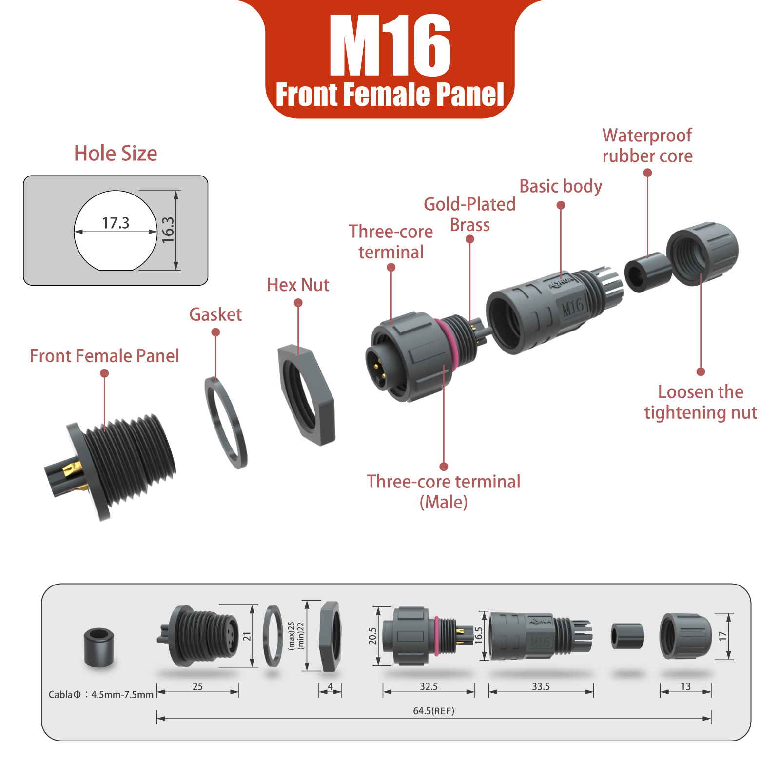 1.M16 plug is suitable for cable outer diamter(OD) range from 2.6mm-7.5mm;