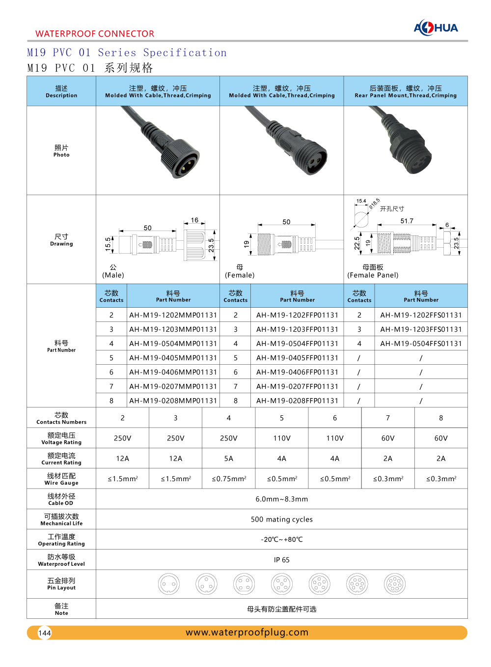 Circular M19 Waterproof Plastic IP65 Panel Cable Connector 2 3 4 Pin