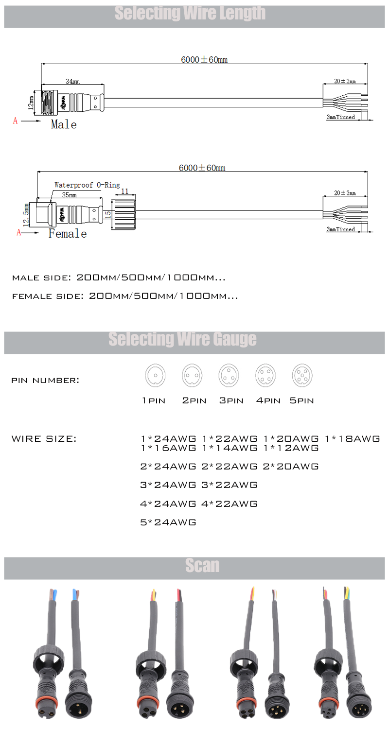 there are male female connector you can select, it is divided into 1pin 2pin 3pin 4pin 5pin, and the connection of male and female connectors by means of torque threads.