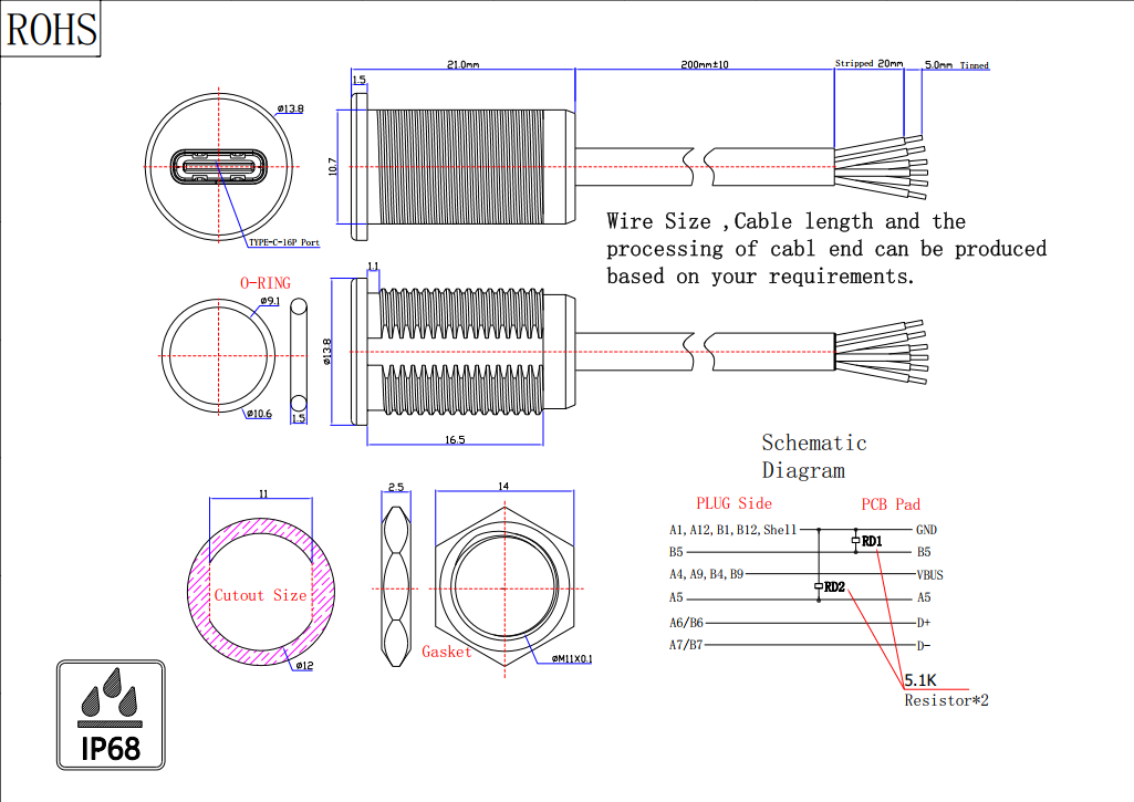 - 1.Key Selling Points: Waterproof Type-C Fast Charging Connector with 5.1K Resistor.