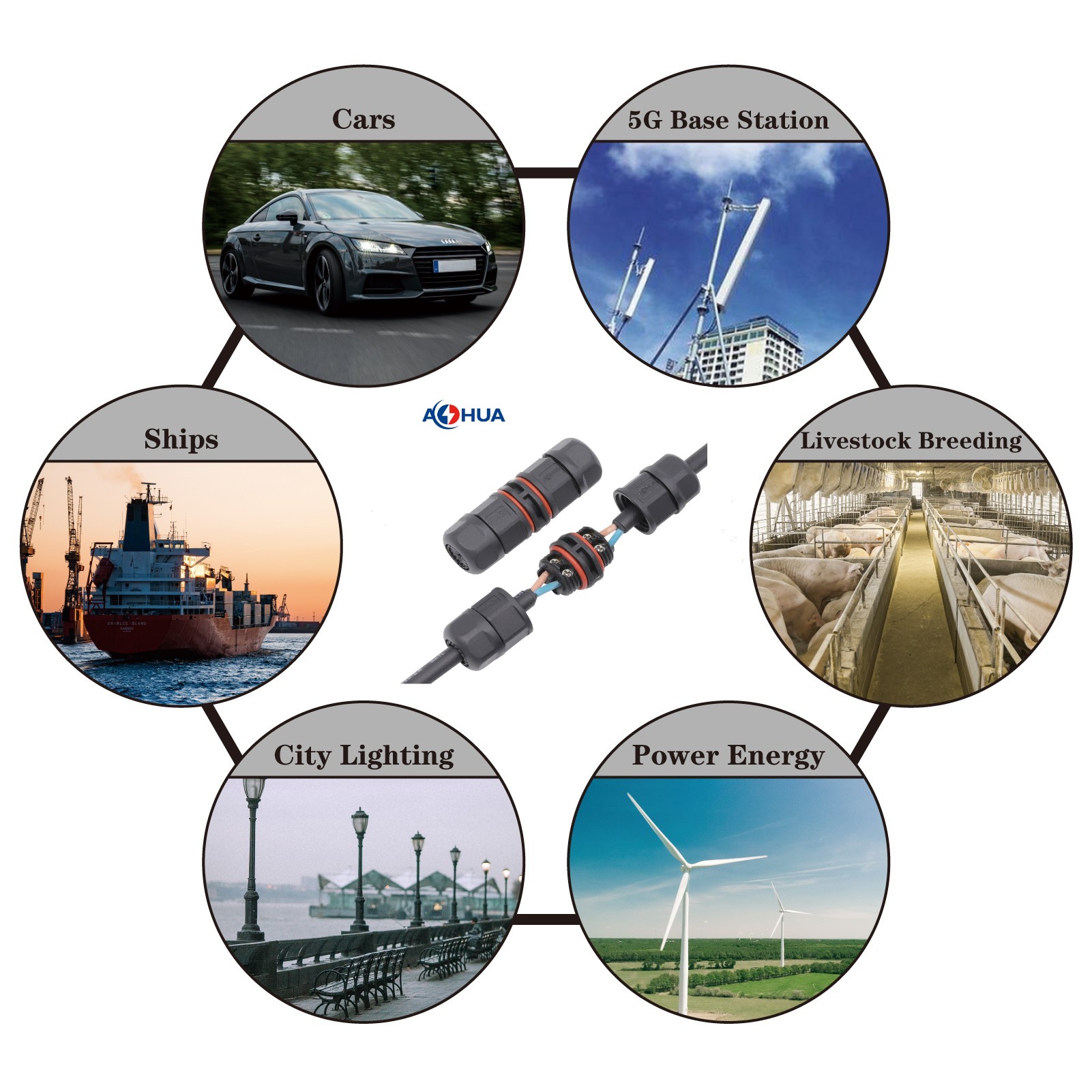 L Assembly waterproof connector is suitable for indoor/outdoor,such as outdoor led lighting, LED panel screens, outdoor security cameras,solar energy inverter, medical device, communications, marine equipment ,control systems, measuring equipment and testing equipment, for data and power and so on.