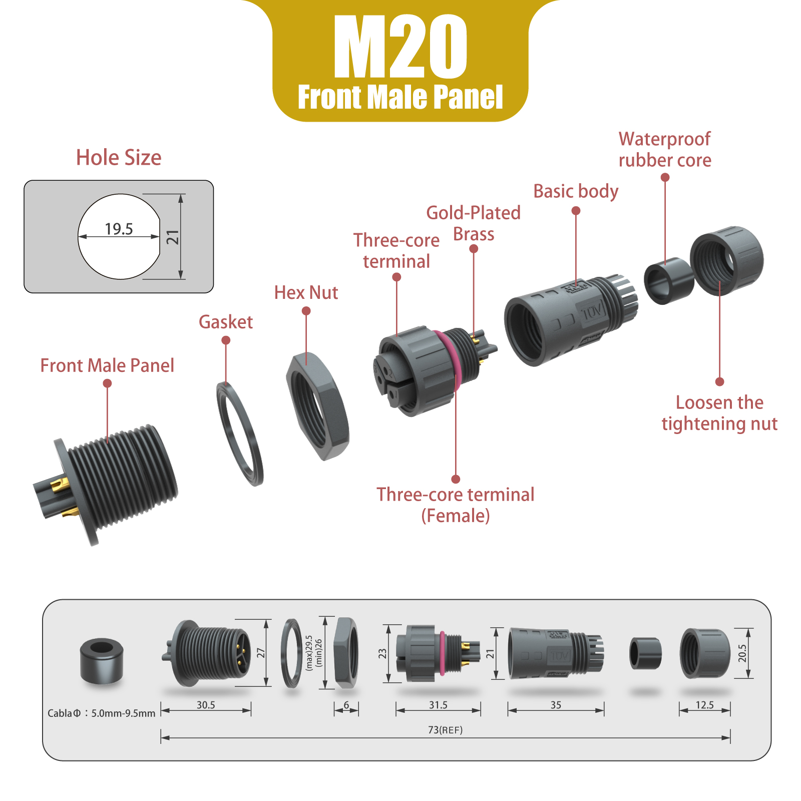M20  assembly waterproof connector can be combined with L/T/Y/F Type connectors to provide a solution for LED lamp modules.