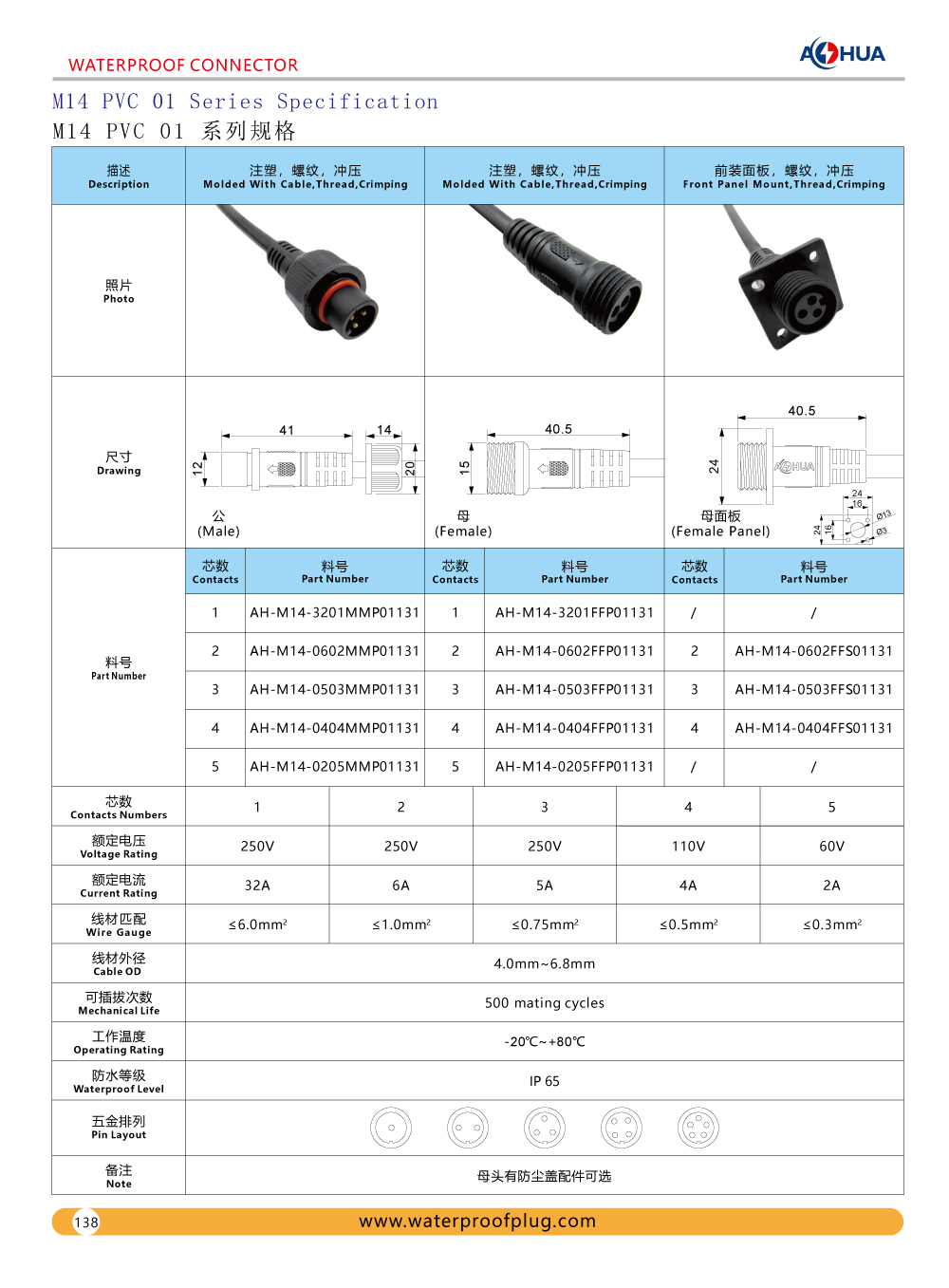 M14 2PIN PVC Waterproof connector M14 2pin LED white pvc Waterproof Connector