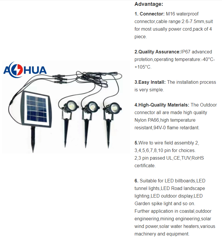 connectors are suitable for quick connection of garden and outdoor displays,floor heating,beacons,cruise ships,LED billboards,LED tunnel lights,LED street lights,external wiring,ect. |