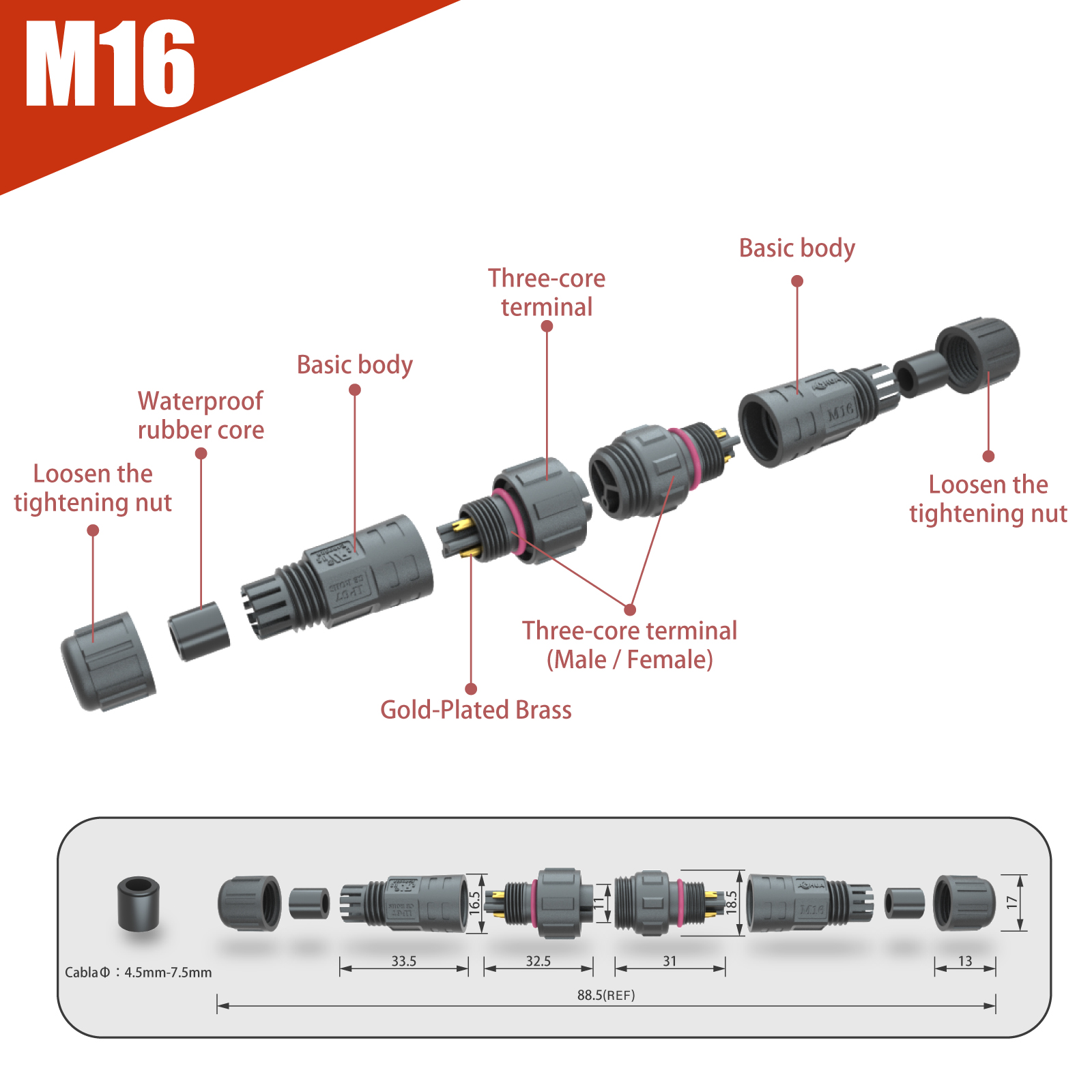2.6-7.5mm(If you use a cable which is too thin,then the seal won't even cover IP67!!) |