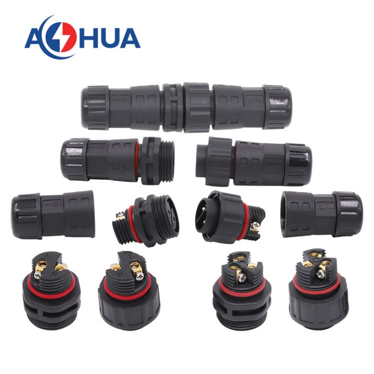 Male/female connectors (right-hand plug/socket): Waterproofing achieved via threaded coupling + sealing ring (red section), typically offering IP67/IP68 protection suitable for outdoor and damp environments.
