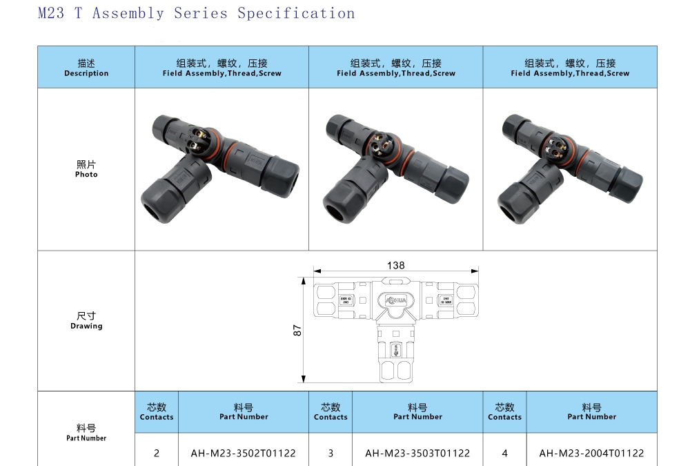 M23 3pin T Waterproof connector Street lighting led 3 wire connector plug