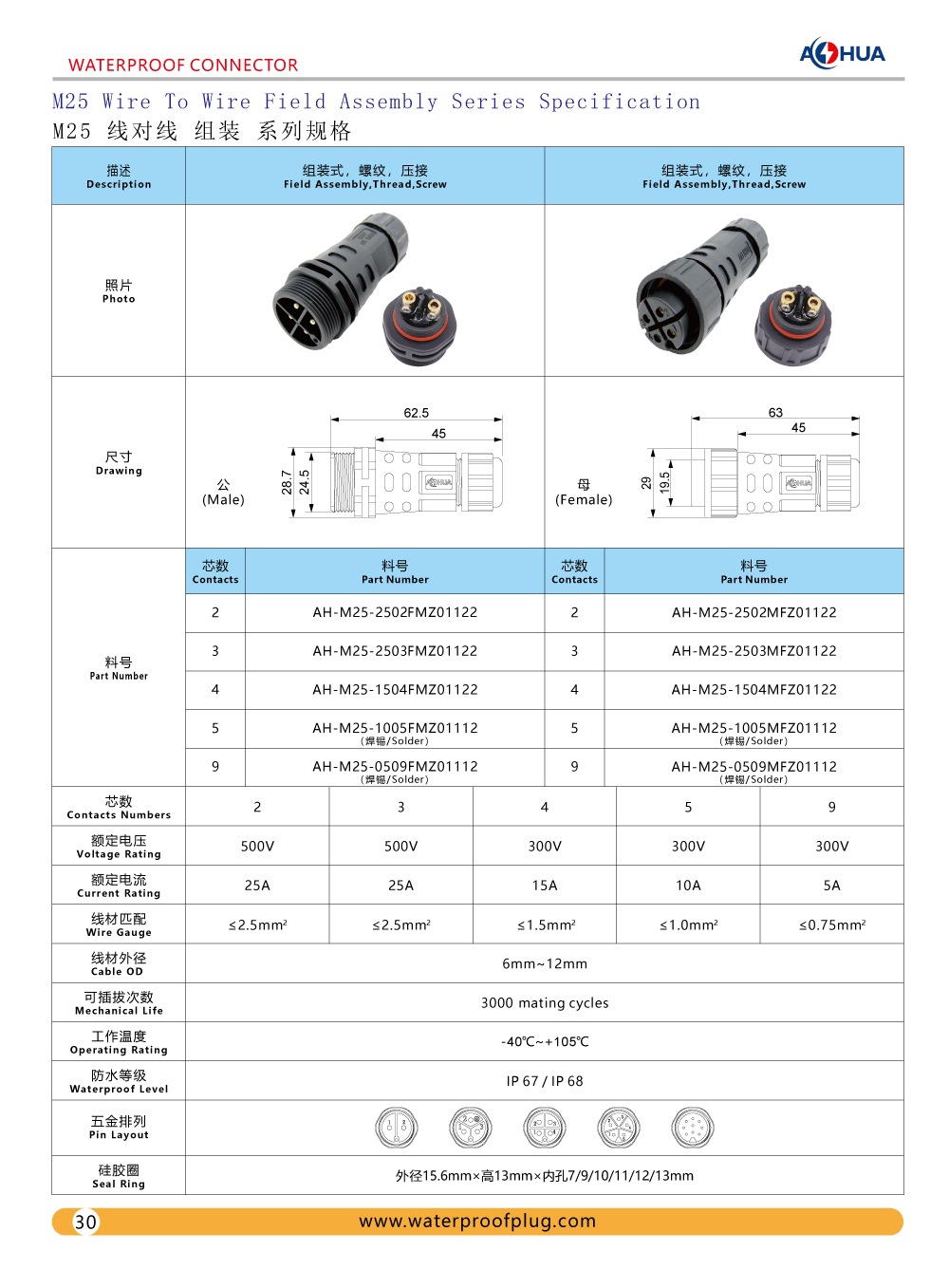 M25 Waterproof connector 2pin m25 male female ip67 connector