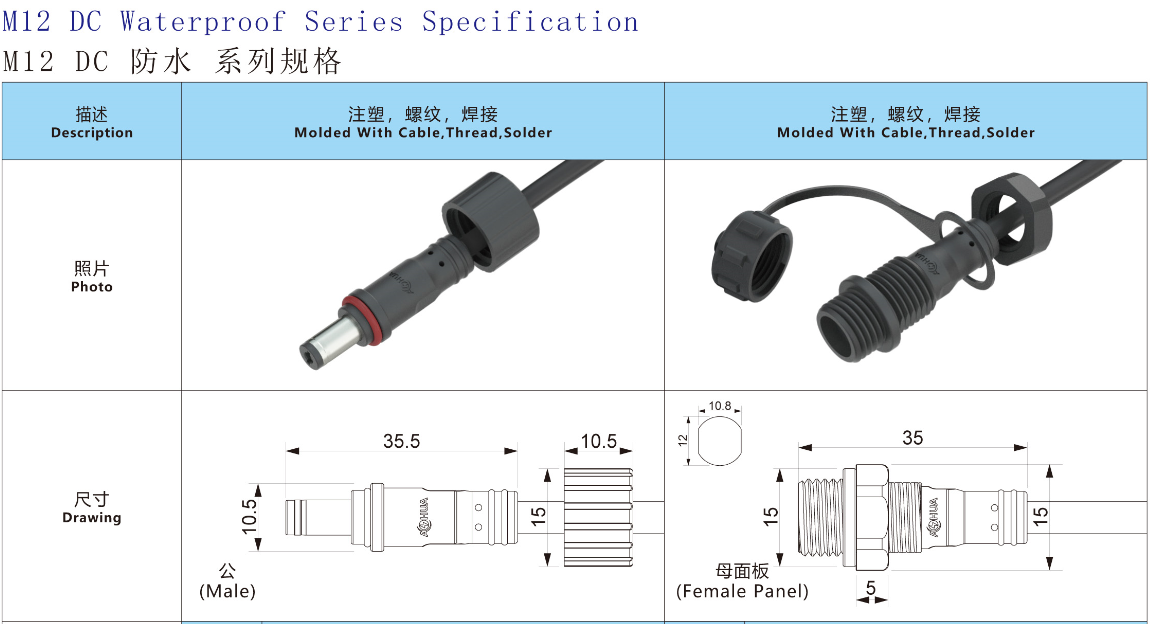 M12 2 Pin 55 21 DC Female Panel Mounted weak Current 5A Power DC Adapter Jack Universal Waterproof Led Wire Connector