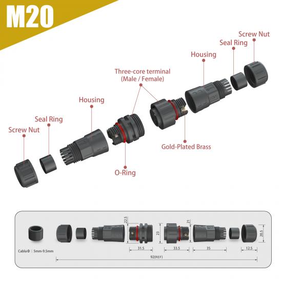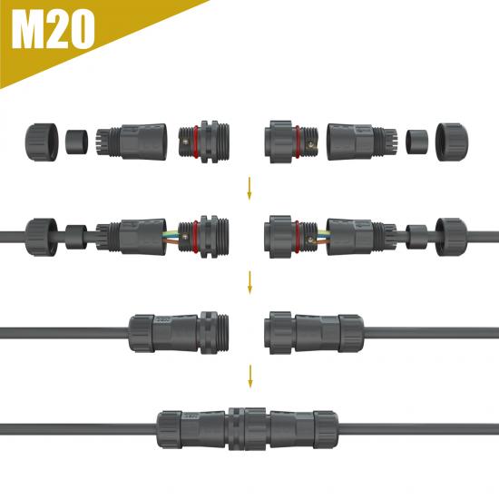 M20 assembly waterproof connector can be combined with L/T/Y/F Type connectors to provide a solution for LED lamp modules.