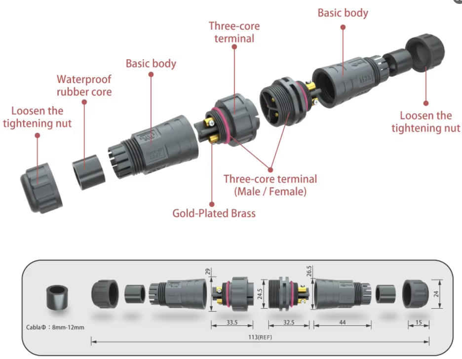 M25 assembly waterproof connector can be combined with L/T/Y/F Type connectors to provide a solution for LED lamp modules.